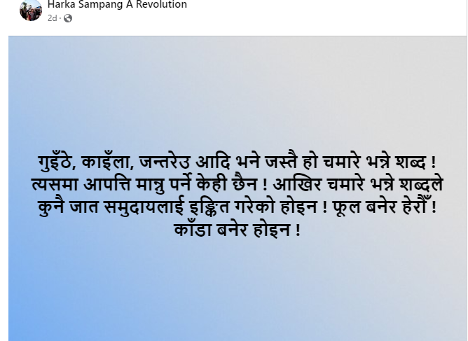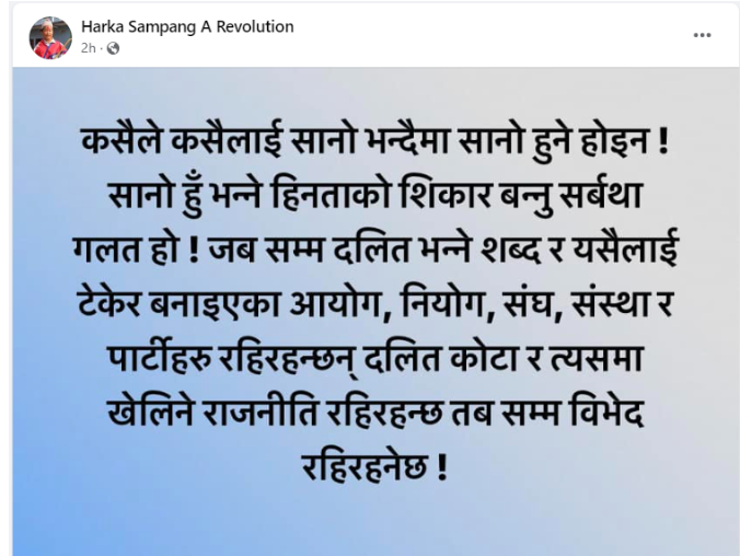सुरुमा चमार जातिको अपमान हुने उखान प्रयोग गरेर स्टाटस लेख्नुभएका साम्पाङलाई राष्ट्रिय दलित आयोगले जात विशेषको अपमान हुने अभिव्यक्ति सच्याउन अनुरोध गर्दा उहाँ दलितप्रति झन्झन् आक्रामक हुँदै स्टाटस लेखिरहनुभएको छ ।