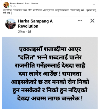 उहाँका स्टाटस दलित समुदायलाई जातीय रूपमा हेप्ने किसिमका भएको भन्दै दलित अधिकारकर्मीहरूले उनीविरुद्ध मुद्दा हाल्ने चेतावनी दिएका हुन्।
