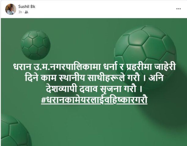 यसैगरी दलित अभियन्ता सुशील विश्वकर्माले पनि स्थानीय दलितलाई उनीविरुद्ध प्रहरीमा जाहेरी दिन अनुरोध गर्नुभएको छ । उहाँ सामाजिक सञ्जालमा लेख्नुहुन्छ, ‘धरान उपमहानगरनगरपालिकामा धर्ना र प्रहरीमा जाहेरी दिने काम स्थानीय साथीहरूले गरौँ । अनि देशव्यापी दबाब सिर्जना गरौँ। धरानका मेयरलाई बहिष्कार गरौँ।’
