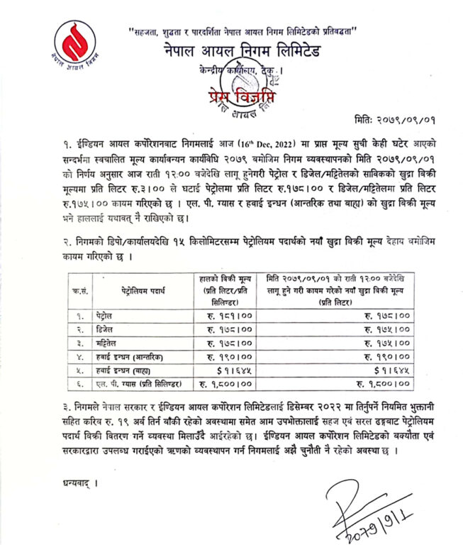 हवाई इन्धन र एलपी ग्याँसको मूल्य भने यथावत नै रहेको निगमका प्रवक्ता विनितमणि उपाध्यायले जानकारी दिनुभयो ।