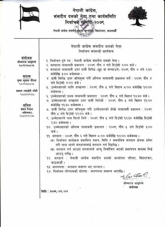 यस्तो छ कांग्रेस संसदीय दलको नेता निर्वाचनसम्बन्धी कार्यतालिका