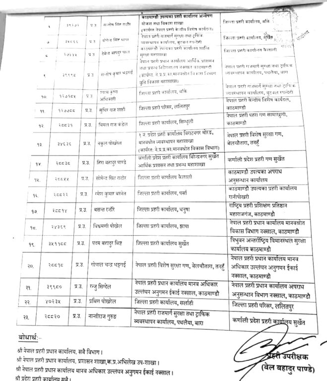 त्यस्तै दुर्गाराज रेग्मीलाई झापा र कोमल शाहलाई पर्सा सरुवा गरिएको छ भने राजकुमार सिलवाल सिन्धुली काजमा खटिएका छन् ।