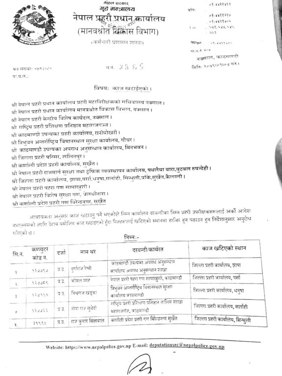 प्रहरी प्रधान कार्यालयका अनुसार विश्वराज खड्कालाई त्रिभुवन विमानस्थलबाट धनुषा सरुवा गरिएको छ भने सन्तोषसिंह राठौरलाई जिप्रका बाँके सरुवा गरिएको छ ।