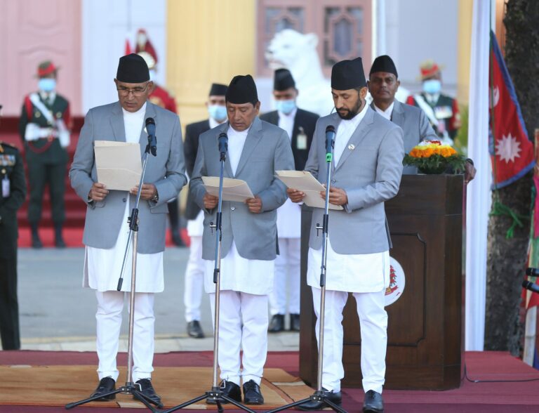 उपप्रधानमन्त्रीमा नेकपा एमालेका विष्णु पौडेल, माओवादी केन्द्रका नारायणकाजी श्रेष्ठ र राष्ट्रिय स्वतन्त्र पार्टीक रवि लामिछाने रहेका छन् । पौडेलले अर्थ, श्रेष्ठले भौतिक पूर्वाधार र लामिछानेले गृह मन्त्रालय सम्हाल्नेछन् ।