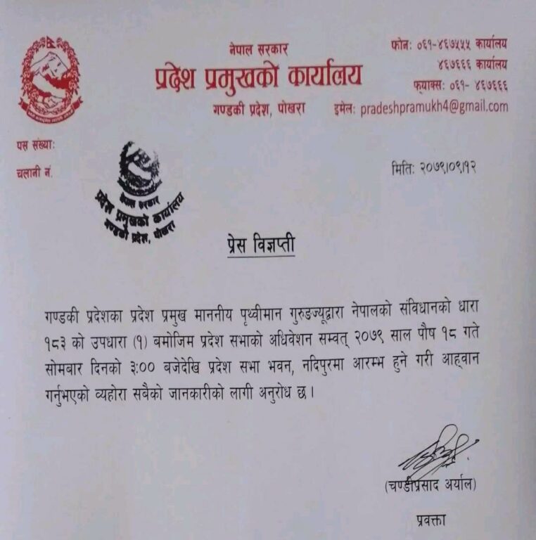 प्रदेश प्रमुखको कार्यालयले जारी गरेको विज्ञप्तिमा भनिएको छ, ‘गण्डकी प्रदेशका प्रदेश प्रमुख माननीय पृथ्वीमान गुरुङज्यूद्वारा नेपालको संविधानको धारा १८३ को उपधारा (१) बमोजिम प्रदेश सभाको अधिवेशन सम्वत् २०७९ साल पौष १८ गते सोमबार दिनको ३ बजेदेखि प्रदेश सभा भवन, नदीपुरमा आरम्भ हुने गरी आह्वान गर्नुभएको व्यहोरा सबैको जानकारीका लागि अनुरोध छ ।’