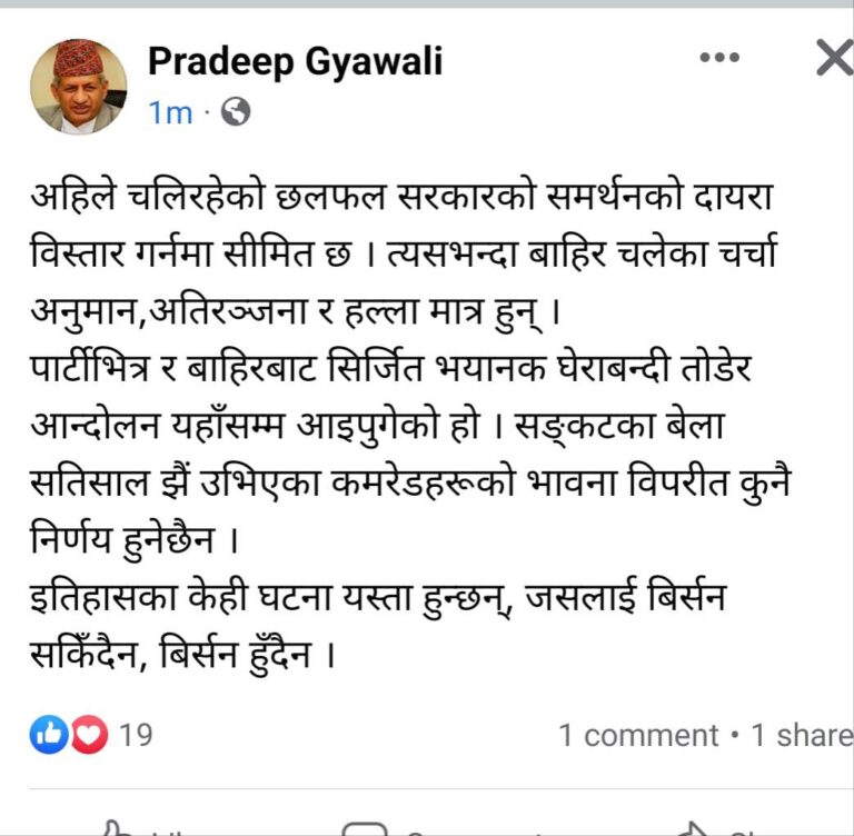 सामाजिक सञ्जाल फेसबुकमा आफ्नो धारणा राख्दै ज्ञवालीले माधव नेपालको नाम नलिएरै अहिलेका छलफल सरकारको समर्थनको दायरा विस्तार गर्नमा सिमित रहेको उल्लेख गर्नुभएको छ । ‘त्यसभन्दा बाहिर चलेका चर्चा,अनुमान।अतिरञ्जना र हल्ला मात्र हुन्’ ज्ञवालीले लेख्नु भएको छ ‘पार्टीभित्र र बाहिरबाट सृजित भयानाक घेराबन्दी तोडेर आन्दोलन यहाँसम्म आइपुगेको हो । संकटका बेला सतिसाल झैं उभिएका कमरेडहरुको भावना विपरित कुनै निर्णय हुने छैन ।’