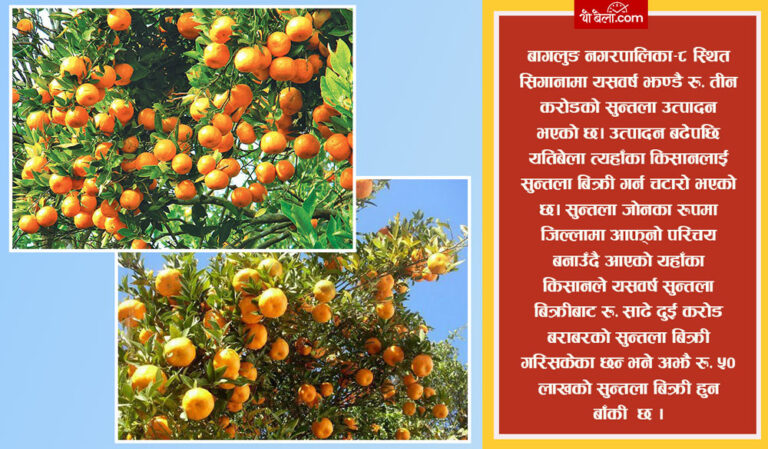 गलकोट – बागलुङ नगरपालिका–८ स्थित सिगानामा यस वर्ष झण्डै रु.तीन करोडको सुन्तला उत्पादन भएको छ। उत्पादन बढेपछि यतिबेला त्यहाँका किसानलाई सुन्तला बिक्री गर्न चटारो भएको छ।