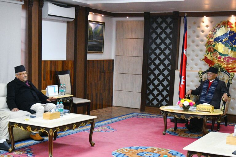 काठमाडौं – सत्ता गठबन्धनका पाँच नेताहरुबीच प्रधानमन्त्रीको सरकारी निवास बालुवाटारमा वार्ता सुरु भएको छ।