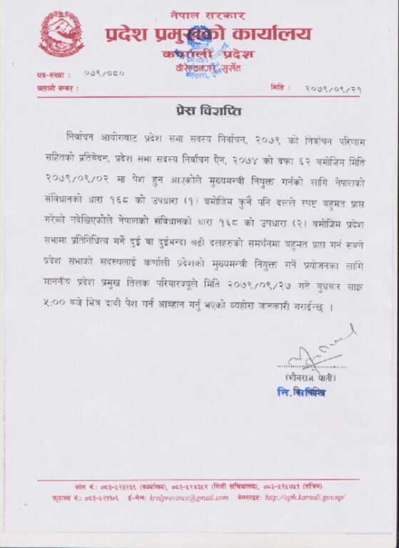 आज प्रदेश प्रमुख कार्यालयले प्रेस विज्ञप्ति जारी गर्दै पुस २७ गते अपरान्ह ५ बजेसम्म मुख्यमन्त्री नियुक्तिका लागि आह्वान गरेको हो।