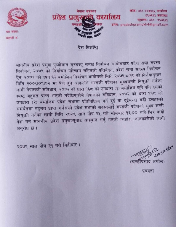 नेपालको संविधान २०७२ को धारा १६८ को उपधारा १ बमोजिम कुनै पनि दलको स्पष्ट बहुमत नदेखिएकाले सोही धाराको उपधारा २ बमोजिम प्रदेश सभामा प्रतिनिधित्व गर्ने दुई वा दुईभन्दा बढी दलहरूको समर्थनमा सरकार गठनका लागि आह्वान गरिएको प्रवक्ता चण्डीप्रसाद अर्यालले जानकारी दिनुभयो ।