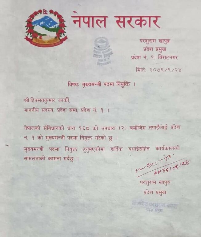 प्रदेश प्रमुख परशुराम खापुङले आज एमाले संसदीय दलका नेता समेत रहेका कार्कीलाई मुख्यमन्त्रीमा नियुक्त गर्नुभएको हो ।