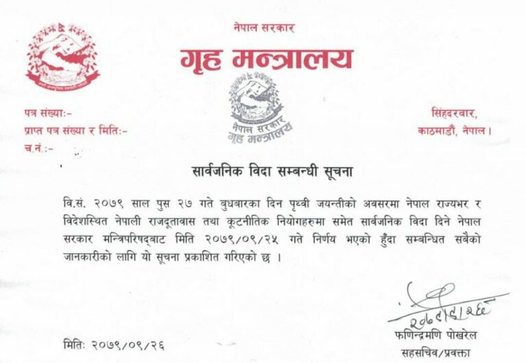 पुस २७ गते पर्ने पृथ्वी जयन्तीको अवसरमा बुधबार सार्वजनिक बिदा दिइएको गृह मन्त्रालयका प्रवक्ता फणिन्द्रमणि पोखरेलले जारी गरेको सूचनामा उल्लख छ ।