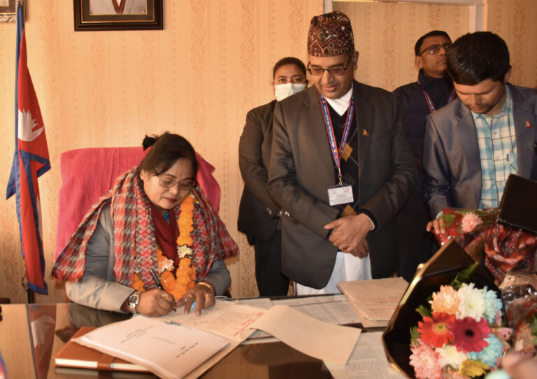 काठमाडौं – महिला, बालबालिका तथा ज्येष्ठ नागरिकमन्त्री भगवती चौधरीले पदभार ग्रहण गर्नुभएको छ।