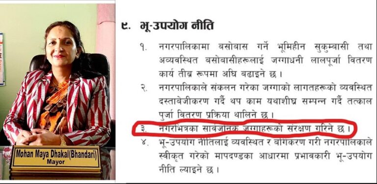 ढकालले आफ्नो निर्वाचन घोषणा पत्रको ‘भू उपयोग नीति’ शीर्षकमा ‘नगरभित्रका सार्वजनिक जग्गाको संरक्षण गरिनेछ’ भनेर प्रतिबद्धता व्यक्त गर्नुभएको थियो ।