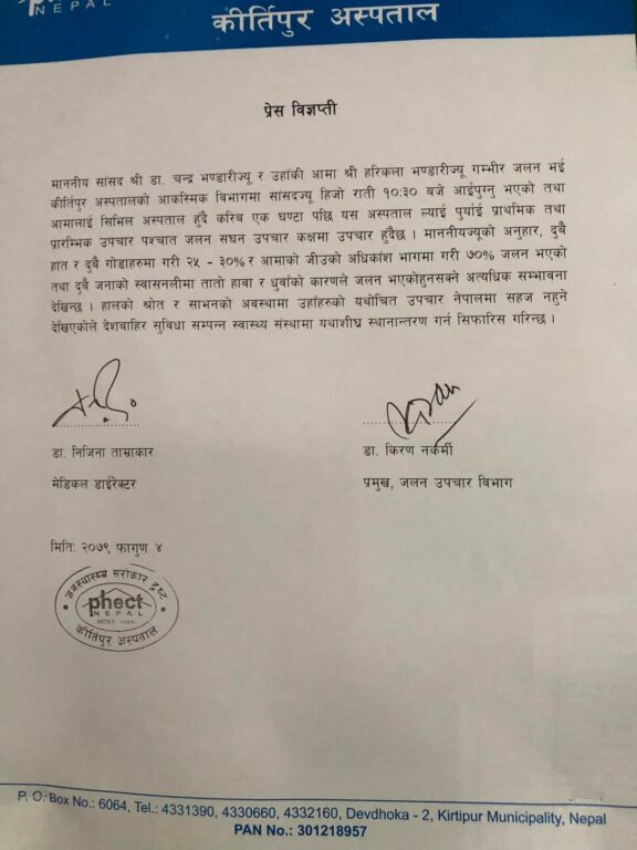 कीर्तिपुर अस्पतालले विज्ञप्ति जारी गर्दै नेपालमा उपचार सहज नहुने भएकोले दुवै जनालाई भारत लगेर उपचार गर्न सिफारिस गरिएको उल्लेख गरेको छ ।