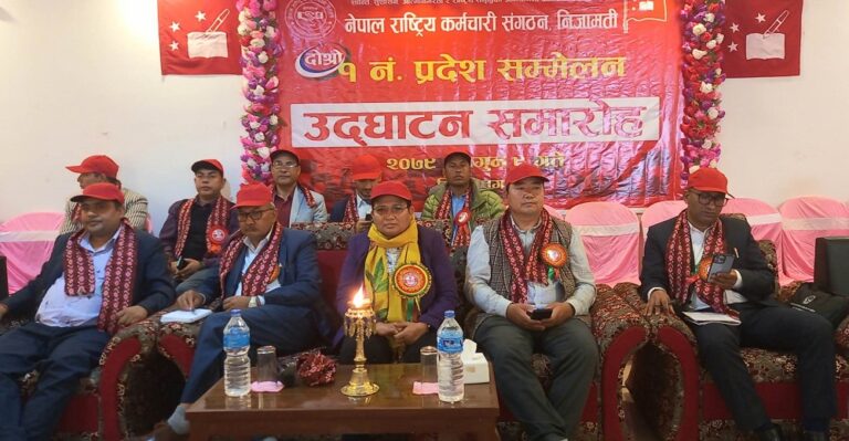 नेपाल राष्ट्रिय कर्मचारी सङ्गठन निजामती प्रदेश-१ सम्मेलनको आज यहाँ उद्घाटन गर्दै उहाँले राष्ट्रहित र जनताको सेवाप्रति प्रतिबद्ध हुनुपर्नेमा जोड दिनुभयो।