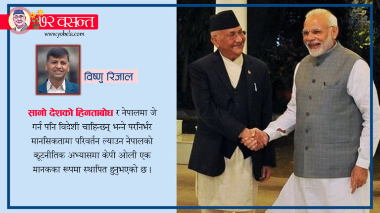 हाम्रा छिमेकी चीन र भारत विशाल छन् । उनीहरूका आकांक्षा पनि विशाल छन्। चीन सबै हिसाबले विश्वको दोस्रो शक्ति भइसकेको छ र पहिलो हुने दौडमा छ । भारत आन्तरिक रूपमा आफूलाई मजबुत बनाउँदै आार्थिक विकासमा केन्द्रित छ । यस्तो बेलामा उनीहरुसँग हीन भावनाले होइन, शीर ठाडो पारेर आफ्ना जायज अडानहरु राख्न सक्दा मात्रै सम्बन्ध बलियो हुन्छ। यस मान्यताको कार्यान्वयन गरेर केपी ओलीले उदाहरण स्थापना गर्नुभएको छ।