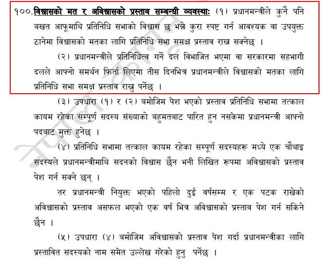 संविधानको धारा १०० को उपधारा २ मा प्रधानमन्त्रीले प्रतिनिधित्व गर्ने दल विभाजित भएमा वा सरकारमा सहभागी दलले आफ्नो समर्थन फिर्ता लिएमा ३० दिनभित्र प्रधानमन्त्रीले विश्वासको मतका लागि प्रतिनिधिसभा समक्ष प्रस्ताव राख्नुपर्ने व्यवस्था छ । त्यसरी पेश भएको प्रस्ताव तत्काल कायम रहेको सम्पूर्ण सदस्य संख्याको बहुमतबाट पारित हुन नसकेमा प्रधानमन्त्री आफ्नो पदबाट मुक्त हुने उल्लेख छ।