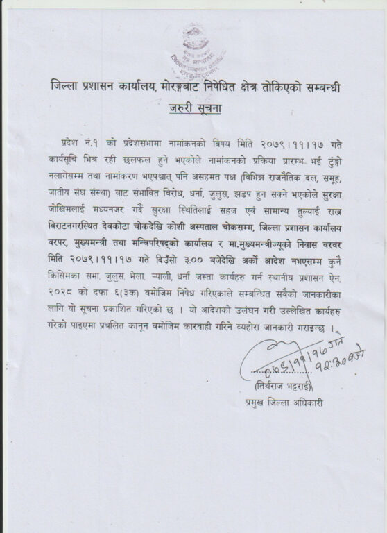 सूचनामा भनिएको छ, ‘सुरक्षा जोखिमलाई मध्यनजर गर्दै सुरक्षा स्थितिलाई सहज एवम् सामान्य तुल्याई राख्न विराटनगरस्थित देवकोटा चोकदेखि कोसी अस्पताल चोकसम्म, जिल्ला प्रशासन कार्यालय वरपर, मुख्यमन्त्री तथा मन्त्रिपरिषद्को कार्यालय र माननीय मुख्यमन्त्रीज्यूको निवास वरपर मिति २०७९/११/१७ गते दिउँसो ३ बजेदेखि अर्को आदेश नभएसम्म कुनै किसिमका सभा, जुलुस, भेला, र्याली, धर्ना जस्ता कार्यहरू गर्न स्थानीय प्रशासन ऐन २०२८ को दफा ६ (३) (क) बमोजिम निषेध गरिएकाले सम्बन्धित सबैको जानकारीका लागि यो सूचना प्रकाशित गरिएको छ । यो आदेश उल्लङ्घन गरी उल्लेखित कार्यहरू गरेको पाइएमा प्रचलित कानुन बमोजिम कारबाही गरिने ब्यहोरा जानकारी गराइन्छ ।’