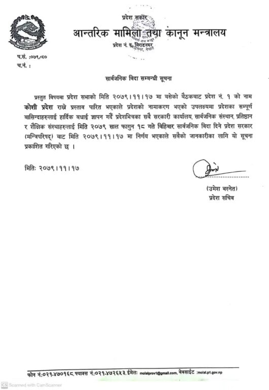 विराटनगर – प्रदेशको नामाकरण भएको खुशियालीमा कोशी प्रदेश सरकारले आज सार्वजनिक विदा दिएको छ । गएराती प्रदेशसभाले प्रदेश १ को नाम कोशी राखेपछि प्रदेशभर विदा दिइएको हो ।
