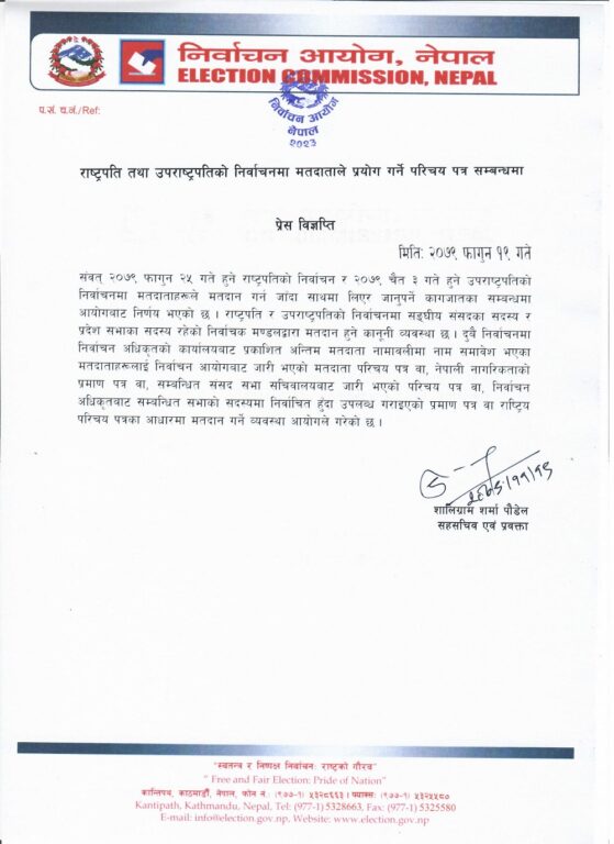 शुक्रबार आयोगका सहसचिव एवम् प्रवक्ता शालिग्राम शर्मा पौडेलले राष्ट्रपति तथा उपराष्ट्रपति निर्वाचनमा मतदाताले प्रयोग गर्ने परिचय पत्रसम्बन्धमा आयोगले निर्णय गरेको जानकारी दिनुभएको हो ।