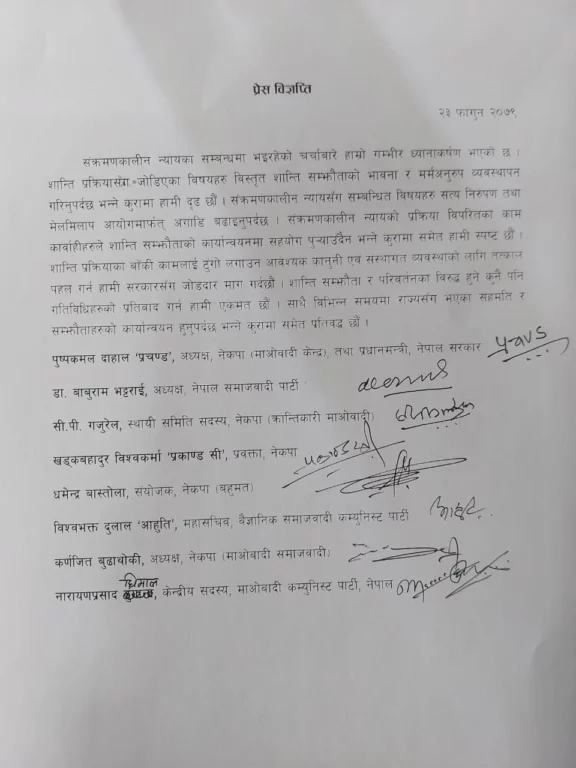 माओवादी धारका ८ दलका नेताहरूको संयुक्त बैठकपछि विज्ञप्ति जारी गर्दै शान्ति प्रक्रियासँग जोडिएका विषयहरू विस्तृत शान्ति सम्झौताको भावना र मर्मअनुरुप व्यवस्थापन गरिनुपर्ने उल्लेख गरेका छन् ।