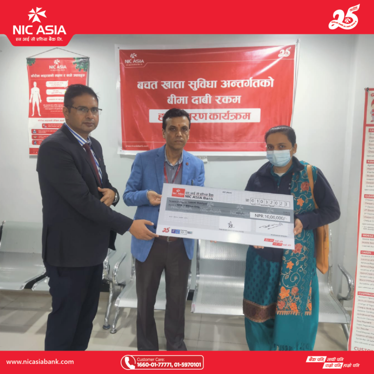 काठमाडौं- एनआईसी एशिया बैंकले दुर्घटनामा परी ज्यान गुमाउनु भएका अर्जुन खरालको परिवारलाई दुर्घटना बीमा वापतको रु. १० लाख उपलब्ध गराएको छ । बैंकमा सर्वश्रेष्ठ बचत खाता खोल्नु भएका रुपन्देही शुद्धोधन गाउँपालिकामा स्थायी घर भएका मृतक खरालको खातामा उपलब्ध दुर्घटना बीमावापतको रकम उहाँकी श्रीमती लक्ष्मी बस्याललाई बैंकका लुम्बिनी प्रदेश प्रमुख तिलक सुन्दर कार्कीले रु. १० लाख रुपैयाँको चेक हस्तान्तरण गर्नुभयो ।