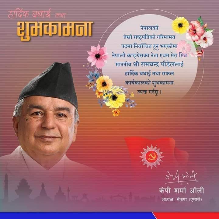 बिहीबार राष्ट्रपतिमा निर्वाचित हुनुभएका पौडेललाई एमाले अध्यक्ष ओलीले बधाई तथा शुभकामना दिनुभएको हो ।