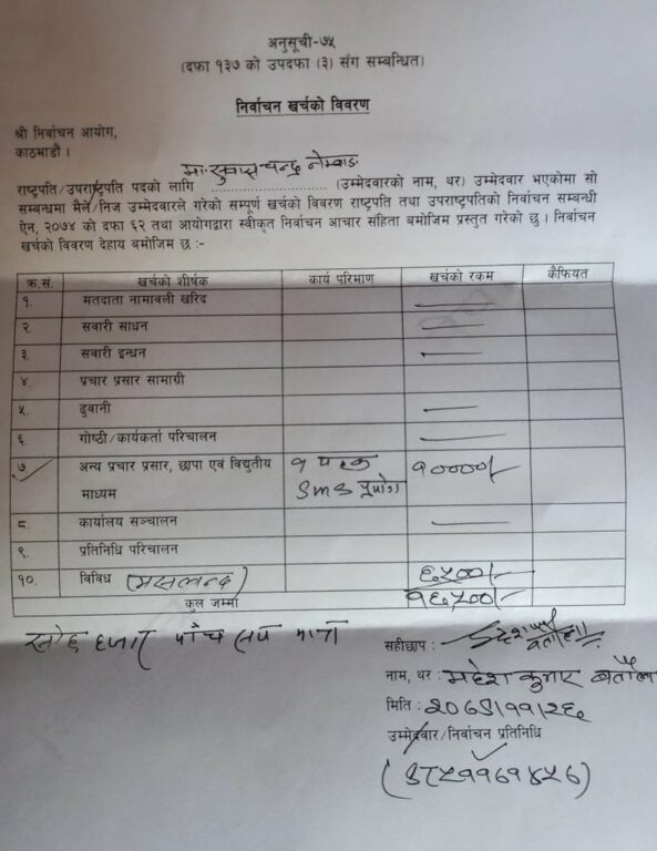 काठमाडौं – राष्ट्रपतिको उम्मेदवार बन्नुभएका नेकपा एमाले उपाध्यक्ष सुवास नेम्वाङले राष्ट्रपति निर्वाचनमा भएको खर्च सार्वजनिक गर्नुभएको छ ।