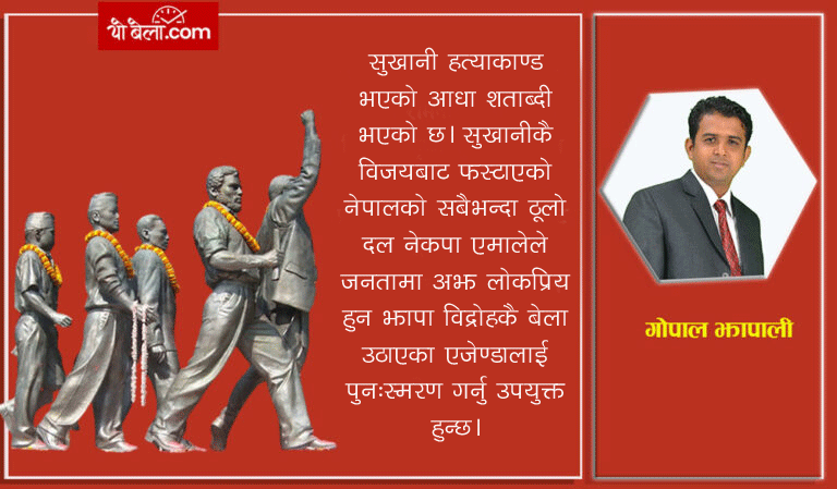 माओवादी शान्तिपूर्ण आन्दोलनका आएका शुरुवाती वर्षहरुमा एमाले र माओवादी विच होड चल्थ्यो, सुखानीको उत्तराधिकारी को हो भनेर । प्रचण्ड भन्थे, सुखानीमा अधुरो रहेको जनविद्रोहलाई हामीले पूरा ग¥यौ भनेर । एमाले अध्यक्ष प्रतिवाद् गर्थे, माओवादीलाई सुखानीको उत्तराधिकारी भन्ने हक छैन भनेर । तर २०७५ सालको फागुन २१ मा सुखानीले एकसाथ पु¥यायो सहादत स्थलमा यि दुवै नेतालाई । एकै पार्टीका दुई अध्यक्षको हैसियतमा उनिहरुले भने ‘झापा विद्रोह तथा सुखानी सहादतको जगमा उभिएको नेपाली कम्युनिष्टहरुको दुई तिहाई नजिकको मतलाई अवमुल्यन गर्ने छैनौं, सहिदको सपना देश र जनताको विपनामा परिणत गर्छौ भनेर ।’ तर त्यो एकताको जुईनु यति कमजोर रहेछ कि, पूँजीवादीहरुको एक झमट हैँसेलेनै चुट्टाई दियो। एकतृत हुँदै गएका नागरिकका चाहना र भरोसा फेरि छिन्नभिन्न भए। फेरि पनि पूँजीवादले सत्ताको हरियो घाँस देखायो ।नेपाली कम्युनिष्ट आन्दोलन विरुद्ध, सहिदका सपनाहरु विरुद्ध, समाजवाद प्राप्तिको आन्दोलन विरुद्ध कम्युनिष्टहरुकै बुई चढेर कम्युनिष्टहरुमाथिै प्रहार गरियो।