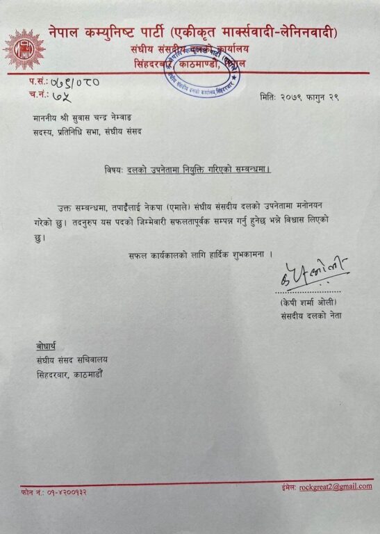 काठमाडौं – नेकपा एमालेको संसदीय दलको उपनेतामा सुवासचन्द्र नेम्वाङ नियुक्त हुनु भएको छ।