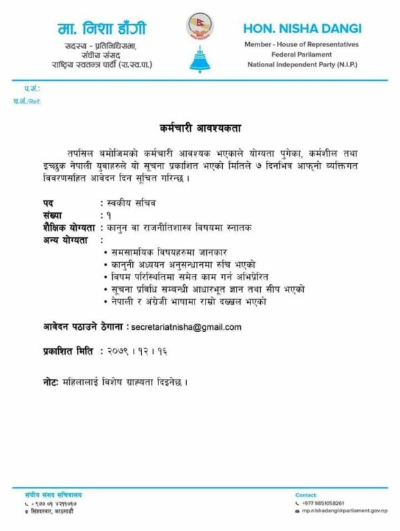 प्रतिनिधिसभा सांसदले आफन्त र नातागोतालाई आफूखुसी स्वकीय सचिवमा नियुक्त गर्ने गरेको आरोप लागिरहेका बेला सांसद डाँगीले विज्ञापनमार्फत स्वकीय सचिवको खोजी गर्नुभएको छ ।