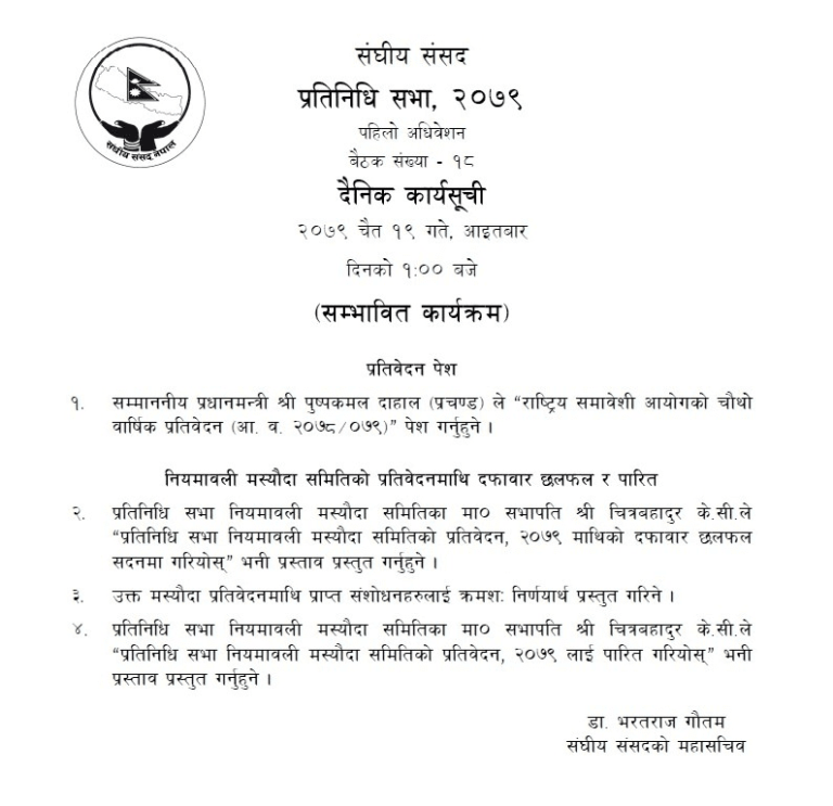 त्यस्तै, प्रतिनिधिसभा नियमावली मस्यौदा समितिका सभापति चित्रबहादुर केसीले ‘प्रतिनिधिसभा नियमावली मस्यौदा समितिको प्रतिवेदन, २०७९ माथिको दफावार छलफल सदनमा गरियोस्’ भनी प्रस्ताव प्रस्तुत गर्नेछन् ।