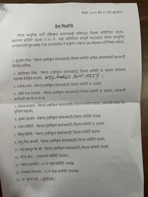काठमाडौं – नेकपा एकीकृत समाजवादी ललितपुर जिल्लाका नेता तथा कार्यकर्ताहरु नेकपा एमालेमै फर्किएका छन्।