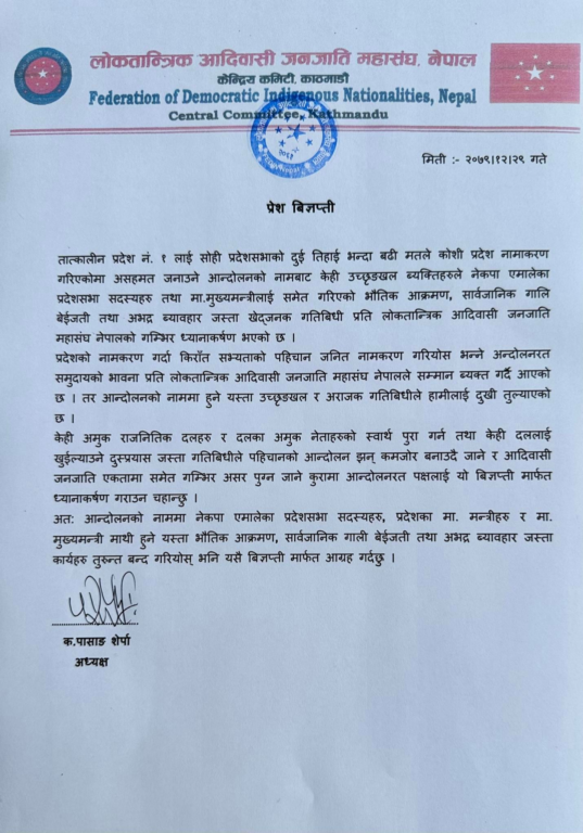 महासंघका अध्यक्ष पासाङ शेर्पाले एक विज्ञप्ति जारी गर्दै नामकरणको विरोधमा गतिविधि गर्ने क्रममा एमालेका प्रदेशसभा सांसद तथा मुख्यमन्त्रीलाई गरिएको भौतिक आक्रमण, सार्वजनिक गाली बेइज्जती तथा अभद्र व्यवहार खेतजनक भएको र यसप्रति महासंघको गम्भीर ध्यानाकर्षण भएको जनाउनु भएको छ ।