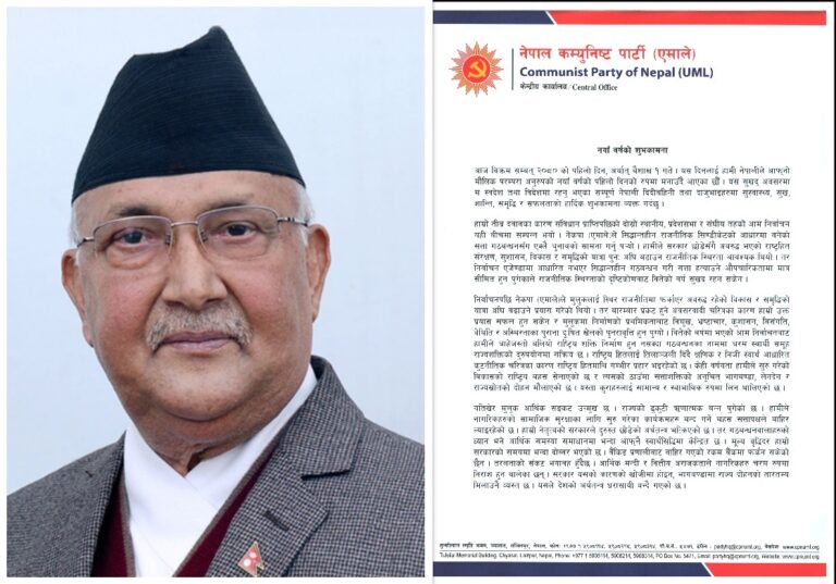 काठमाडौँ-नेकपा एमालेका अध्यक्ष केपी शर्मा ओलीले बितेको वर्ष सुखद हुन नसकेको बताउनु भएको छ । नयाँ वर्ष २०८० को शुभकामना दिनुहुँदै अध्यक्ष ओलीले राजनीतिक स्थिरताको दृष्टिकोणले बितेको वर्ष सुखद हुन नसकेको बताउनु भएको हो ।