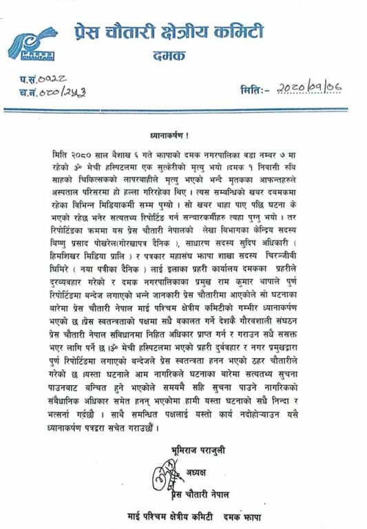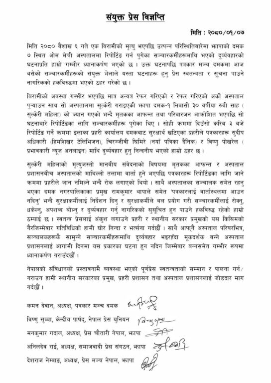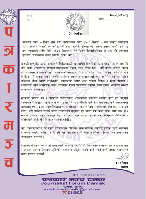 यसैगरी पत्रकार मञ्चका अध्यक्ष कमन देवानले जारी गरेको विज्ञप्तीमा दमक नगरपालिकाका मेयर राम थापाको निर्देशनमा प्रहरीले पिडित र अस्पताल व्यवस्थापन बीचको वार्तास्थलको समाचार संकलनमा रोक लगाएकोप्रति आपत्ती जनाउनुभएको छ । नेपालको संविधानको २०७२ को प्रस्तावनामा नै उल्लेख भएको प्रेस स्वतन्त्रतालाई सम्मान गर्न सम्बन्धित पक्षलाई स्मरण गराउनु भएको छ ।