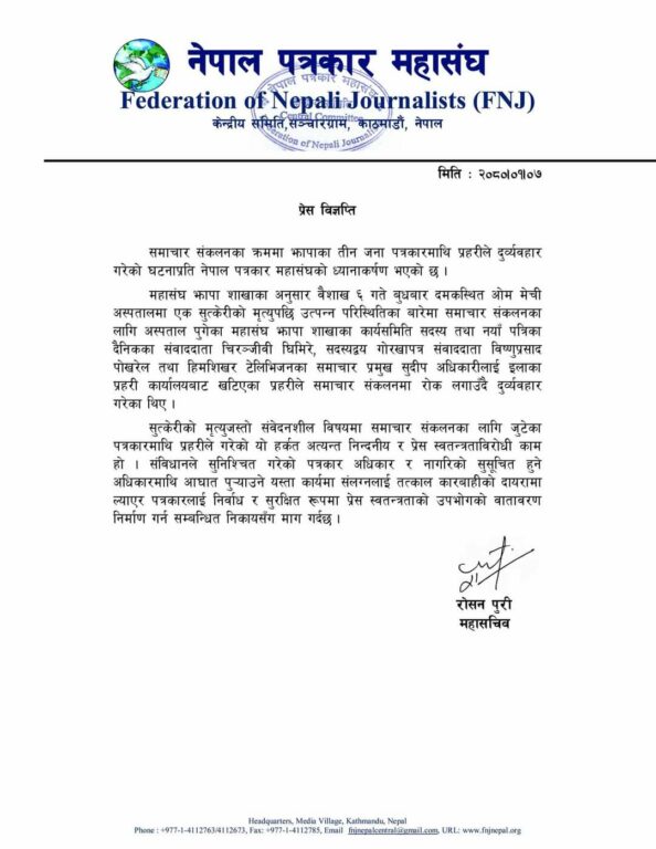 महासंघका महासचिव रोशन पुरीले जारी गरेको विज्ञप्तीमा पत्रकारको समाचार संकलन गर्न पाउने अधिकारलाई कुण्ठित गर्ने प्रहरीको हर्कत स्वतन्त्र पत्रकारिताको खिलापमा रहेको उल्लेख गरिएको छ ।