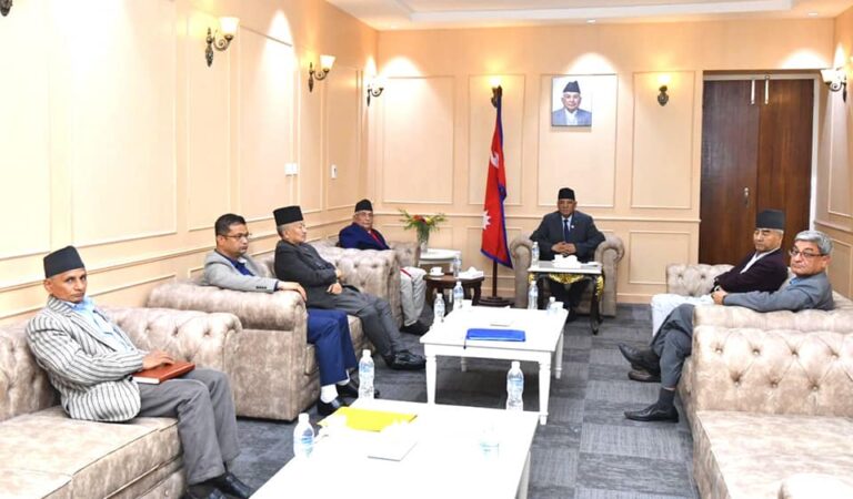 संसदीय समितिको भागबण्डा, टिआरसी विधेयक लगायतका विषयमा छलफल गर्न प्रधानमन्त्री तथा मन्त्रिपरिषदको कार्यालय सिंहदबारमा तीन दलका शीर्ष नेताबीच बैठक भइरहेको हो ।