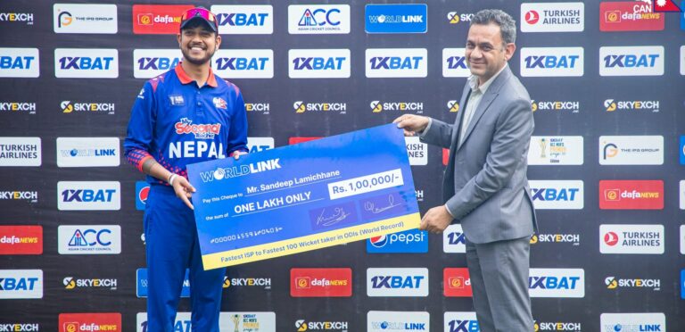 काठमाडौं – सर्वाधिक छिटो १०० एक दिवसीय विकेटको कीर्तिमान रचेका सन्दीप लामिछानेले एक लाख नगद पुरस्कार प्राप्त गरेका छन् । उनलाई ट्रफी र उपहार पनि प्रदान गरिएको छ।