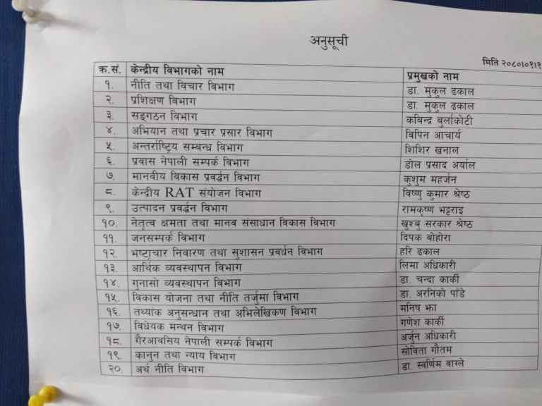 जसअनुसार नीति तथा विभाग विभागको प्रमुखमा डा. मुकुल ढकाल चयन भएका छन् । यसैगरी प्रशिक्षण विभागको प्रमुखमा पनि ढकाल नै चयन भएका छन् । संगठन विभागको प्रमुखमा कविन्द्र बुर्लाकोटी, अभियान तथा प्रचार प्रसार विभाग विपीन आचार्य, अन्तर्राष्ट्रिय सम्बन्ध विभाग शिशिर खनाल, प्रवास नेपाली सम्पर्क विभागमा डोलप्रसाद अर्याल प्रमुख चयन भएका छन्।