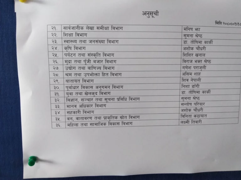 यसैगरी मानवीय विकास प्रवर्द्धन विभागको प्रमुखमा कुसुम महर्जन, उत्पादन प्रवर्द्धन विभाग रामकृष्ण भट्टराई, नेतृत्व क्षमता तथा मानव संशोधन विभाग खुस्बुसरकार श्रेष्ठ, जनसम्पर्क विभाग दीपक बोहरा, भ्रष्टाचार निवारण तथा सुशासन प्रवर्द्धन विभाग हरि ढकाल, आर्थिक व्यवस्थापन विभाग निमा अधिकारी, गुनासो व्यवस्थापन विभाग डा. चन्दा कार्की, विकास, योजना तथा नीति तर्जुमा विभाग अरनिको पाडे, अथ्यांक अनुसन्धान विभाग मनिष झा चयन भएका छन् ।