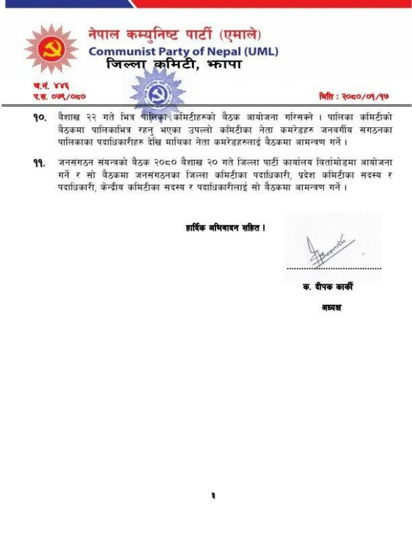 जिल्ला अध्यक्ष दिपक कार्कीको अध्यक्षतामा हिजो बसेको बैठकले केन्द्रीय कमिटीका पदाधिकारी र सदस्यहरुको झापा बसाइ सहज बनाउन नौवटा समिती गठन गरेर विभिन्न नेताहरुलाई जिम्मेवारी दिएको छ ।