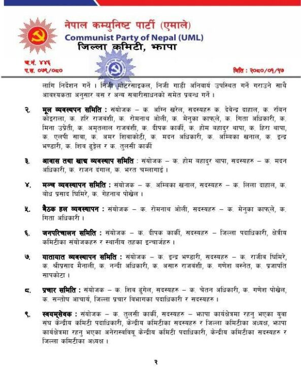प्रचार समितीको संयोजनको जिम्मा शिव ढुंगेलाई दिएको छ भने सदस्यहरुमा चेतन अधिकारी,गणेश पोखरेल,सन्तोष आचार्य हुनुहुन्छ । यसैगरी जिल्ला प्रचार विभागका सदस्यहरुलाई पनि प्रचारप्रसारको जिम्मेवारी दिइएको छ । स्वंयसेवक परिचालन समितीको संयोजक तुलसी कार्कीलाई जिम्मा दिइएको छ । समितीक सदस्यहरुमा युवा संघ तथा अनेरास्ववियुको केन्द्रीय नेतृत्वमा रहेका सम्पूर्ण सदस्यहरुलाई समितीको सदस्यको जिम्मेवारी दिइएको एमाले झापाले जारी गरेको निर्देशनमा उल्लेख छ ।
