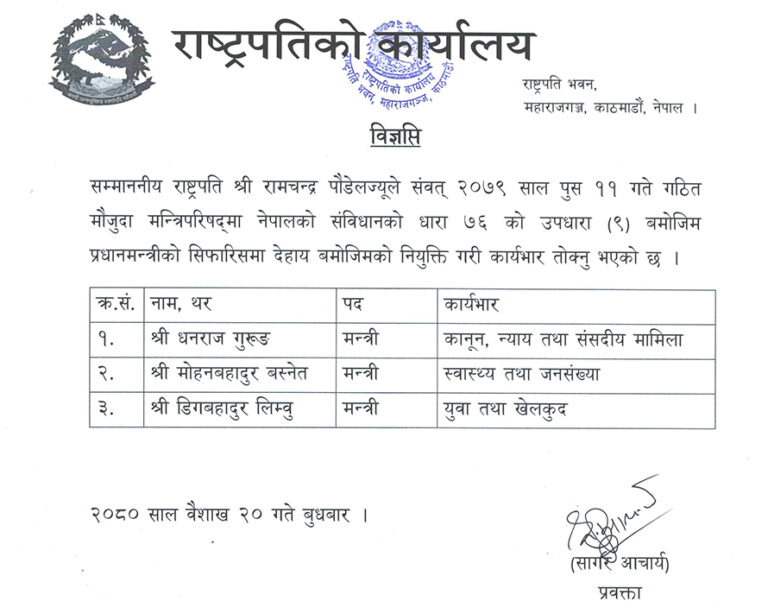 राष्ट्रपति कार्यालयका प्रवक्ता सागर आचार्यले प्रधानमन्त्री दाहालको सिफारिसमा राष्ट्रपति पौडेलले गुरुङ, बस्नेत र लिम्बूलाई मन्त्री नियुक्त गरी कार्यभार तोकेको जानकारी दिनुभयो ।