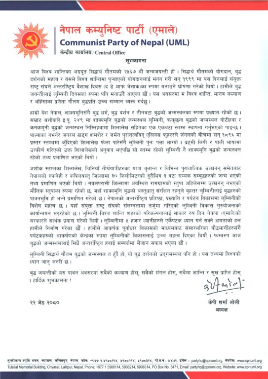 काठमाडौं -नेकपा एमालेका अध्यक्ष केपी शर्मा ओलीले २५६७ औं बुद्धजयन्तीका अवसरमा शुभकामना व्यक्त गर्नुभएको छ ।