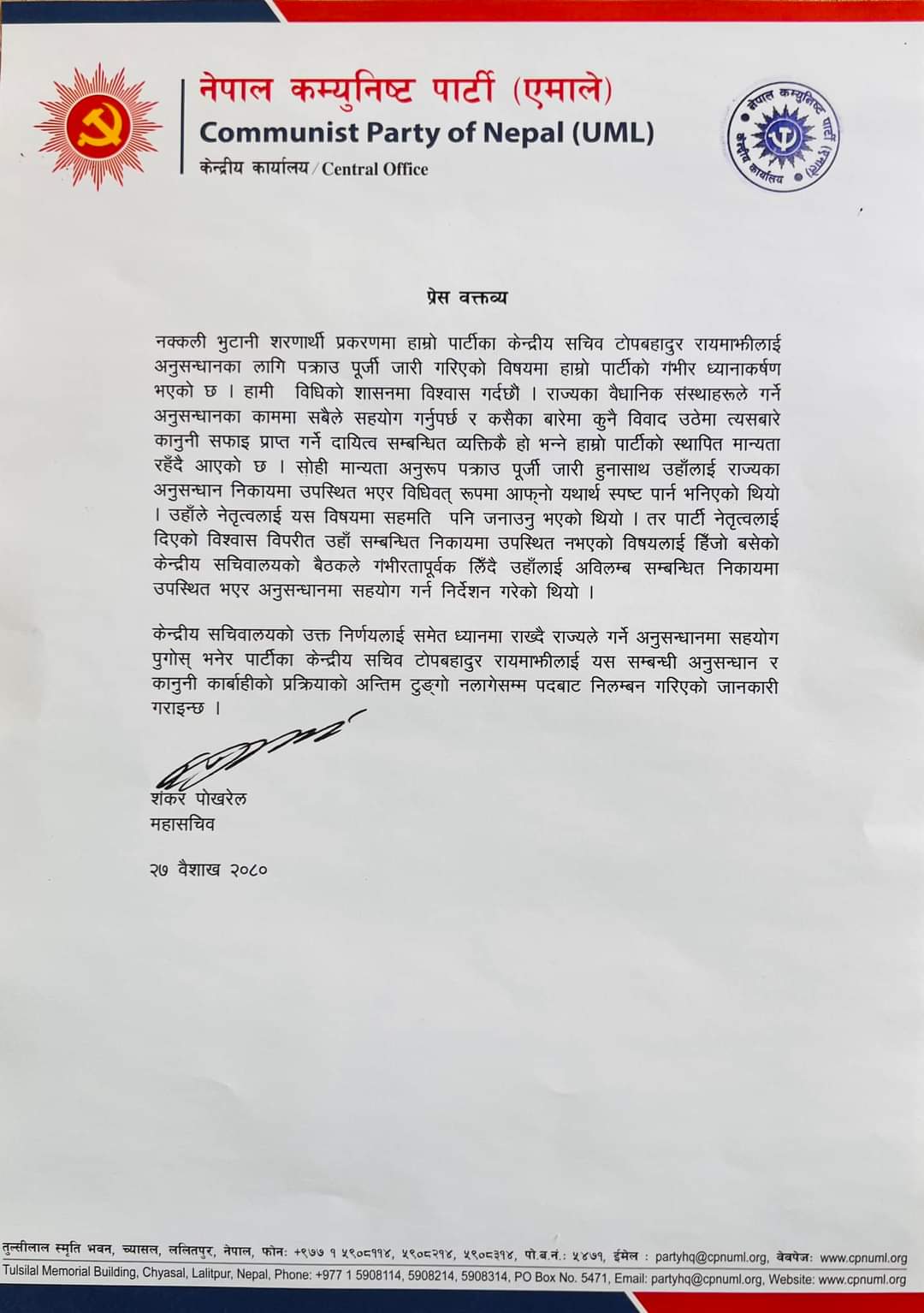 विज्ञप्तीमा पोखरेलले राज्यका वैधानिक निकायहरुले गर्ने अनुसन्धानमा सबैले सहयोग गर्नुपर्ने पार्टीको मान्यता अनुरुप नै उहाँले आफ्नो कुरा राख्न पार्टीले निर्देशन दिएको उल्लेख छ । पक्राउ पुर्जी जारी भएपछि उहाँले प्रहरीमा आएर आफ्नो कुरा राख्ने प्रतिवद्धता नेतृत्व समक्ष गरे पनि हालसम्म सम्पर्क नआएकोले यस विषयको छिनोफानो नभएसम्मका लागि सचिव पदबाट उहाँलाई निलम्बन गरिएको जनाइएको छ ।