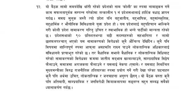 ‘समग्र मुलुक जस्तै त्यो प्रदेश पनि बहुजातीय,बहुभाषिक,बहुसाँस्कृतिक,बहुधार्मिक र भौगोलिक विविधताले युक्त प्रदेश हो ’ एमालेको केन्द्रीय कमिटीले पास गरेको प्रस्तावमा भनिएको छ ‘यस प्रदेशलाई बहुपहिचान झल्किने गरी कोशी नामाकरण गरिनु उचित र स्वभाविक हो भन्ने पार्टीको मान्यता रहेको छ ।’