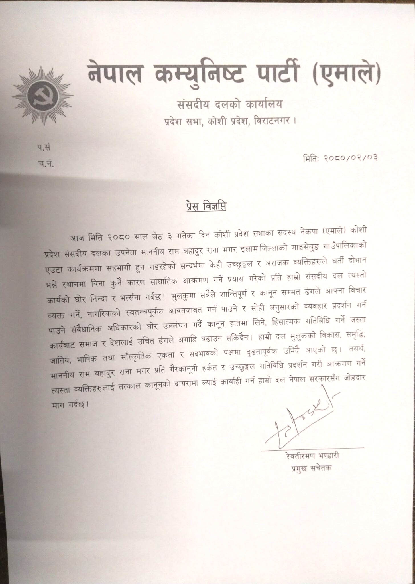 प्रमुख सचेतक भण्डारीले बुधबार दिउँसो प्रेस विज्ञप्ती निकाल्दै केही उच्छृङ्खल र अराजक व्यक्तिहरुले विना कुनै कारण सांघातिक आक्रमण गर्ने प्रयास गरेको जानकारी दिनु भएको हो। आक्रमणको उक्त प्रयासप्रति एमाले संसदीय दलको कार्यालयले घोर निन्दा र भर्त्सना गर्दै संलग्नलाई कारबाहीको माग गरेको छ।