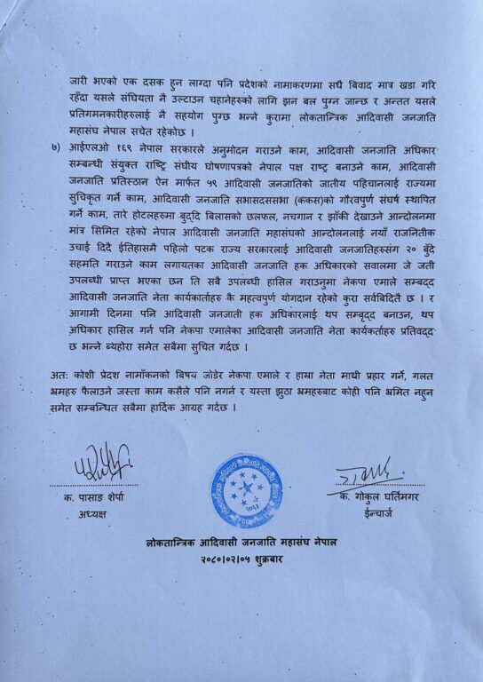 आदिवासी आन्दोलनका नाममा कुनै अमुक दललाई पछ्याइ पछ्याइ आक्रमण गर्नु आन्दोलनकै बेइज्जत भएकोले यस्तो कार्यलय आदिवासी एकतामा समेत खलल पुर्याउने उल्लेख गरिएको छ ।